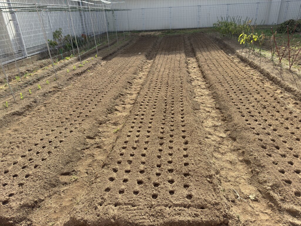 通常は種まき機械でやるのですが、間引きの作業が追いつかないので穴をあけて一粒ずつ蒔いていきます。