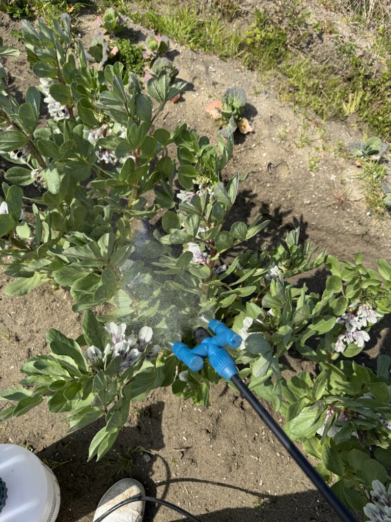 ソラマメの天敵であるアブラムシの寄せ付けない効果もあるかもしれない食酢を葉面散布します。