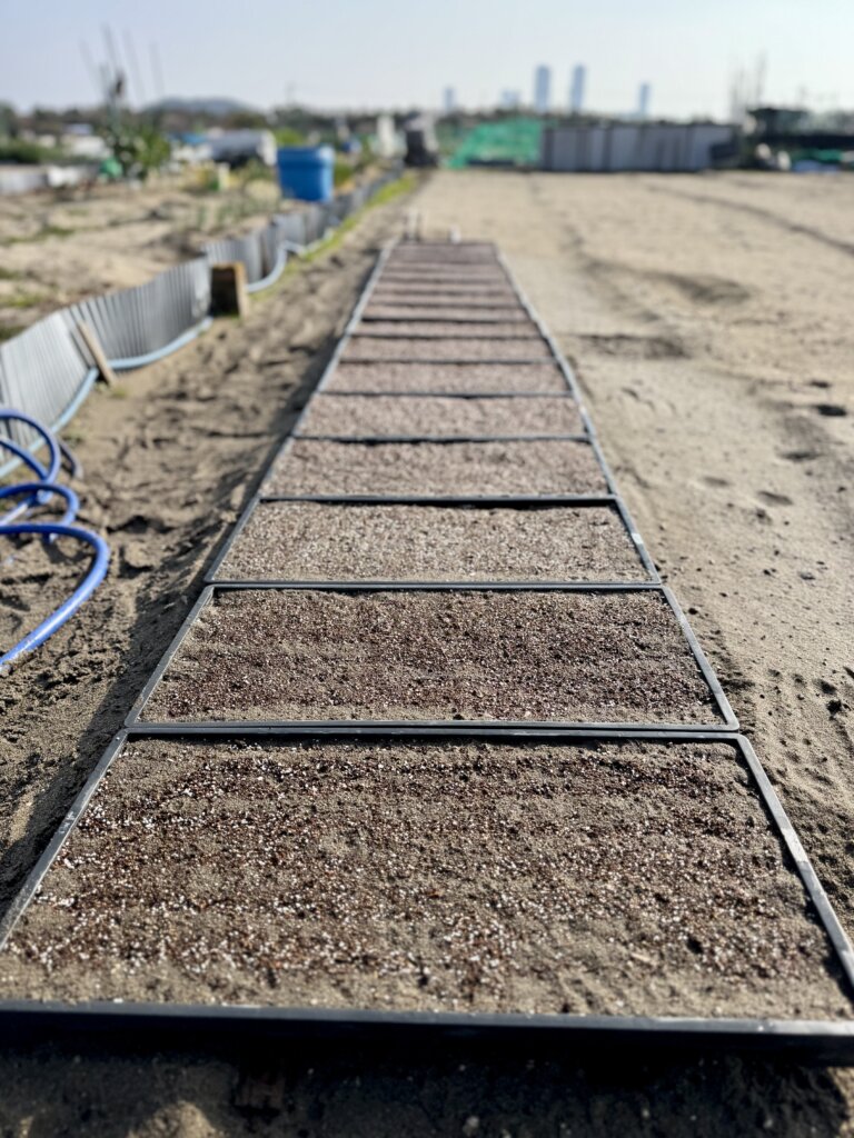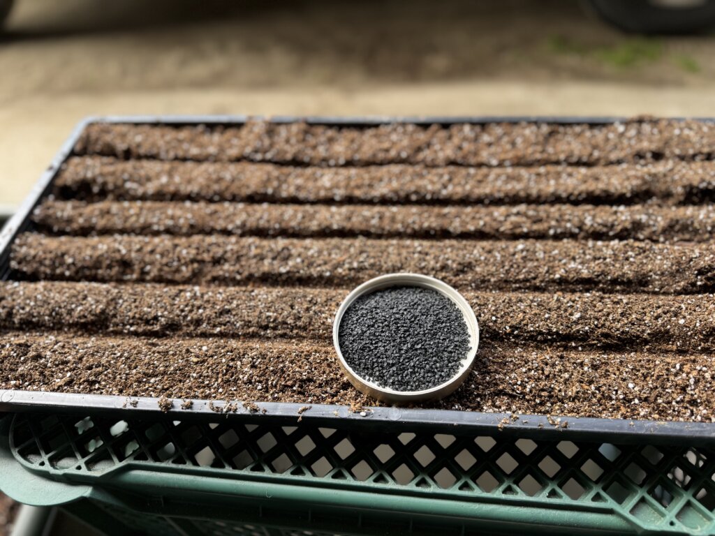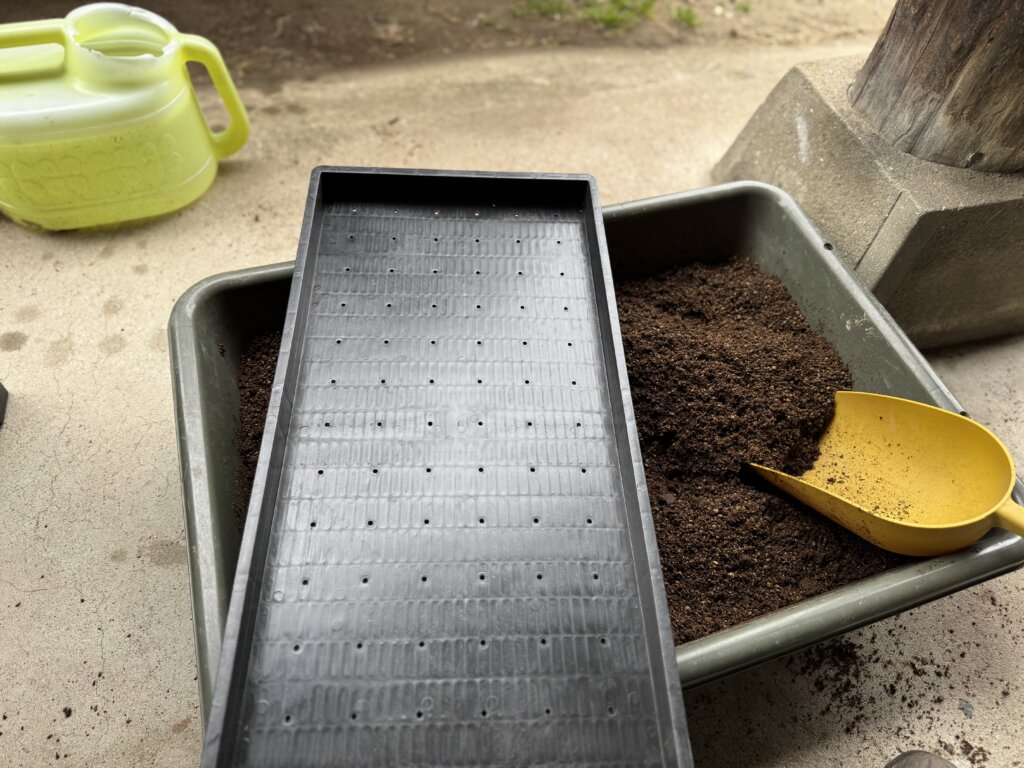 育苗箱に培土を入れて種まきをします!