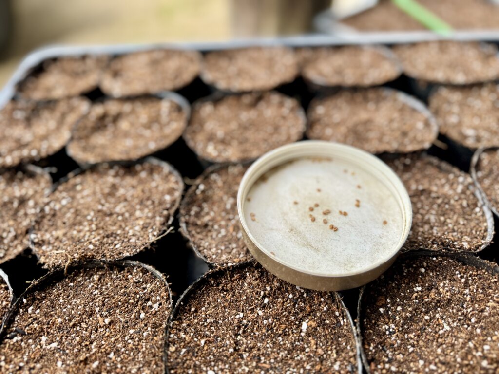 ポットで育苗をします!種は吹けば飛んでいくほど小さくて平たいです。